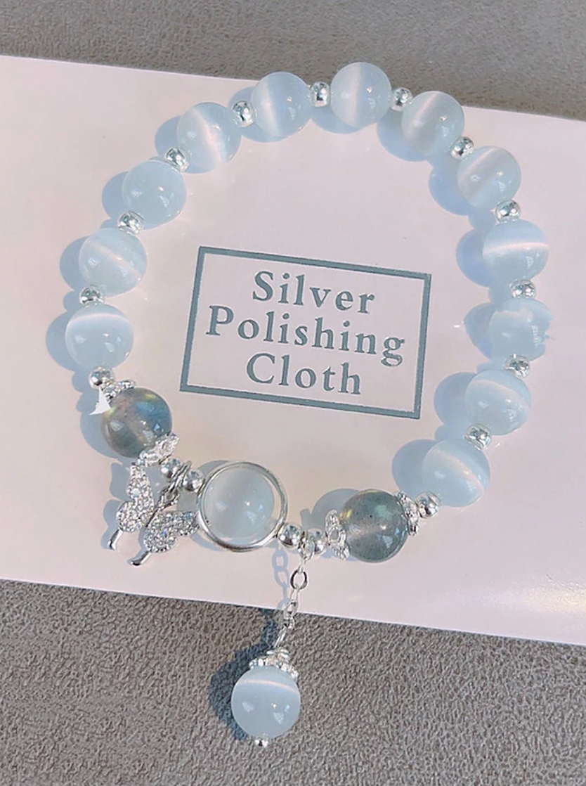 [Designhøydepunkter]: De intrikate detaljene på sommerfuglsjarmen og de fine sølvkapslene rundt fokusperlen fremhever armbåndets estetiske uttrykk. Den dinglende perlen, som er festet til fokuspunktet med et tynt sølvkjede, gir det elegante designet et lekent preg som gjør det allsidig til ulike anledninger.